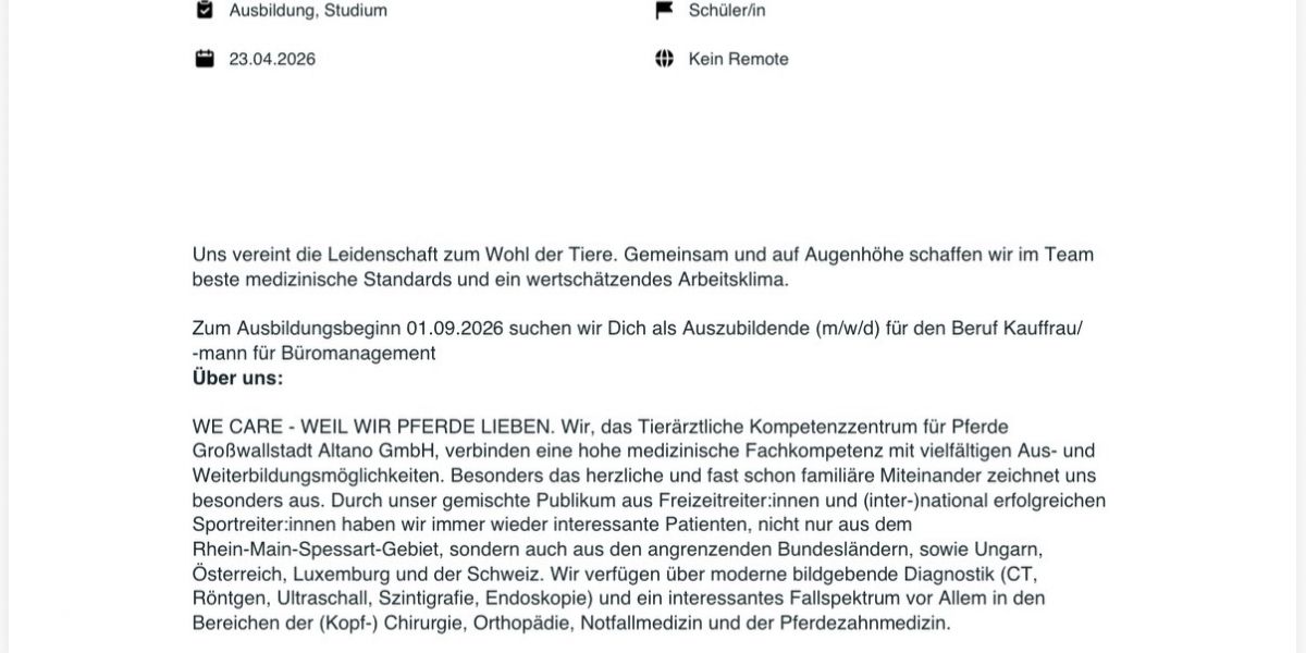 🐴Du liebst Pferde und m… 11 March 2026 🐴Du liebst Pferde und möchtest mit ihnen arbeiten? Dann bewirb dich jetzt bei uns für eine Ausbildung zur Tiermedizinischen Fachangestellten! Unterstütze unsere Tierärzte & Tierärztinnen bei Behandl… weiterlesen